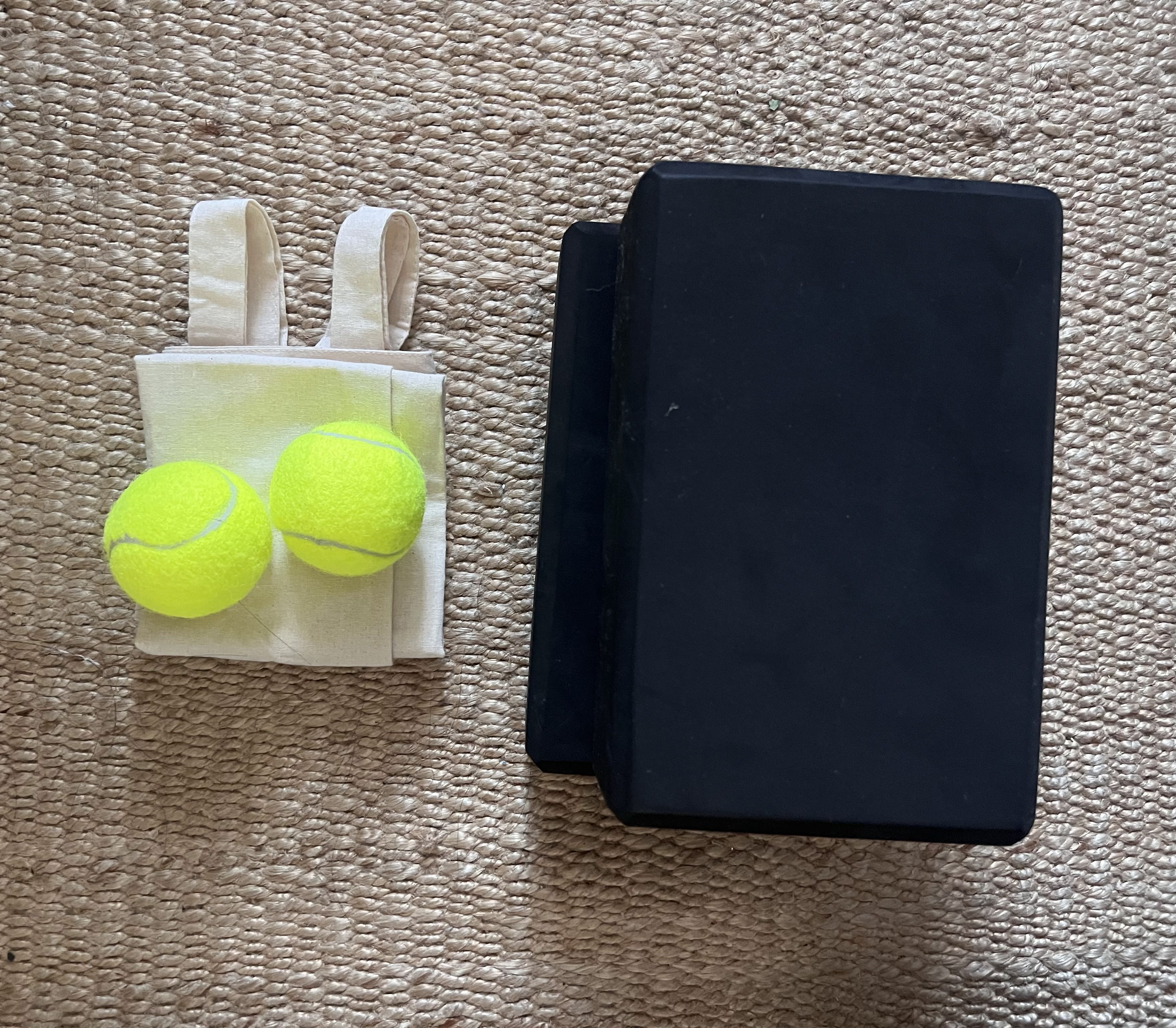Yoga Mat, 2 Tennis balls and 2 yoga blocks can be purchased in Kmart, Big W or Decathlon.